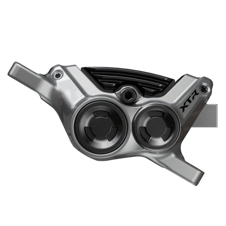 Brzdový třmen na horské kolo Shimano XTR BR-M9200 s polymerovými destičkami P03A. Čtyřístkové provedení třmenu jej předurčuje pro použití na enduro, kde poskytuje vysoký brzdný účinek.