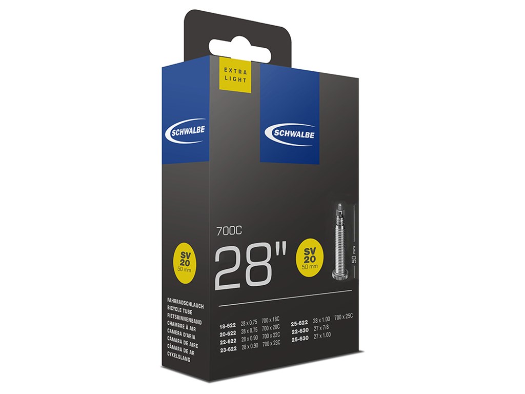 Duše na silniční kolo Schwalbe 28 SV20 50mm 18/25-622/630 s galuskovým ventilkem o délce 50 mm a hmotností pouhých 65g. Duši je možné používat do následujících plášťů