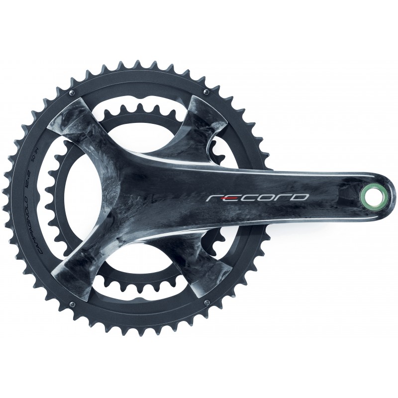 Špičkové karbonové kliky na silniční kolo Campagnolo Record 12s UT s převodníky 52-36 zubů, které jsou speciálně upravené pro použití s 12-ti rychlostnímy systémy. Zdvojené náběhy klik zajišťují rychlejší odezvu na řazení. Kliky jsou tradičně vyrobeny z karbonového vlákna. Karbonové kliky jsou osazené ocelovými poloosami spojenými jediným, ocelovým, šroubem. Součástí poloos jsou průmyslová ocelová ložiska s nízkým valivým odporem. Nové jsou též převodníky s upravenými náběhy pro rychlejší řazení, které se nepřichytávají navzájem k sobě, ale jsou šroubovány přímo do klik. Toto integrované uchycení převodníků umožňuje montáž veškerých vyráběných kombinací převodníků na jeden typ klik. Převodníky se do klik utahují lehkými duralovými šroubky.