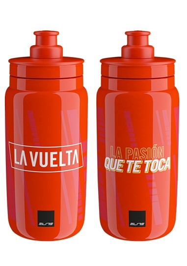 Špičková láhev na kolo Elite Fly v designu Vuelta která se vyznačuje velice nízkou hmotností a jemným náústkem, díky kterému tekutina lépe proudí.