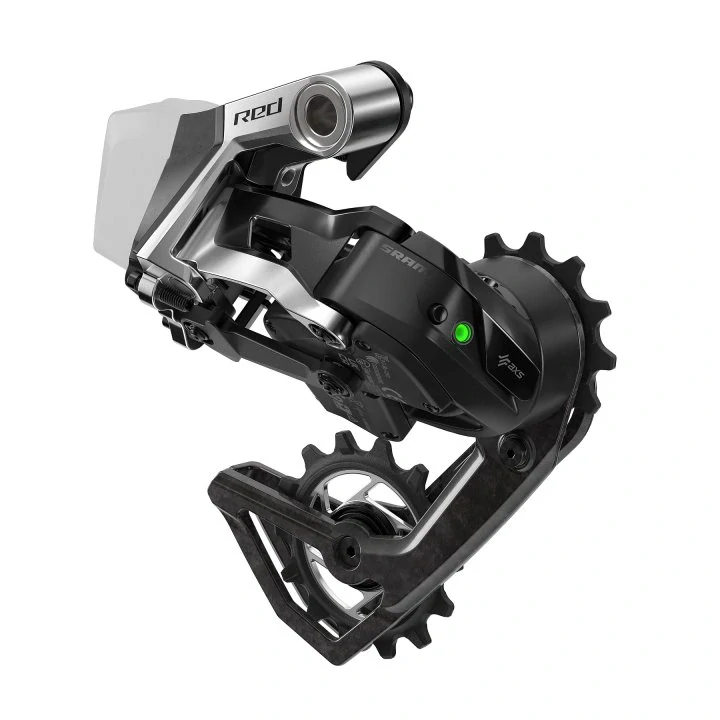 Elektronická, bezdrátová přehazovačka Sram Red AXS E1, která pojme kazetu s až 36 zuby. Díky elektronickému systému AXS přehazovačka poskytuje rychlé a přesné řazení za všech podmínek. Větší kladky přispívají k hladkému chodu díky snížení zalomení řetězu. Hydraulické tlumení Orbit udržuje vše na svém místě i při jízdě po nerovném a rozbitém povrchu.