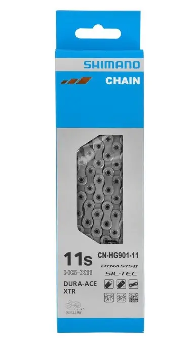 Špičkový jedenáctirychlostní řetěz Shimano CN-HG901 určený k sadám Dura-Ace a XTR 11 speed. Díky povrchové úpravě Sil-Tec se řetěz vyznačuje snadným chodem a delší životností