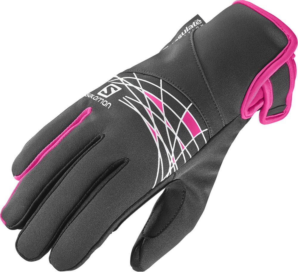 Dámské zateplené rukavice Salomon Thermo black/pink, které jsou určené na běhání nebo na běžky. Rukavice jsou voděodolné a mají Thinsulate zateplení díky čemuž poskytují dokonalou ochranu před vodou a chladem. Syntetická kůže na dlani rukavice zajišťuje lepší držení běžeckých holí.